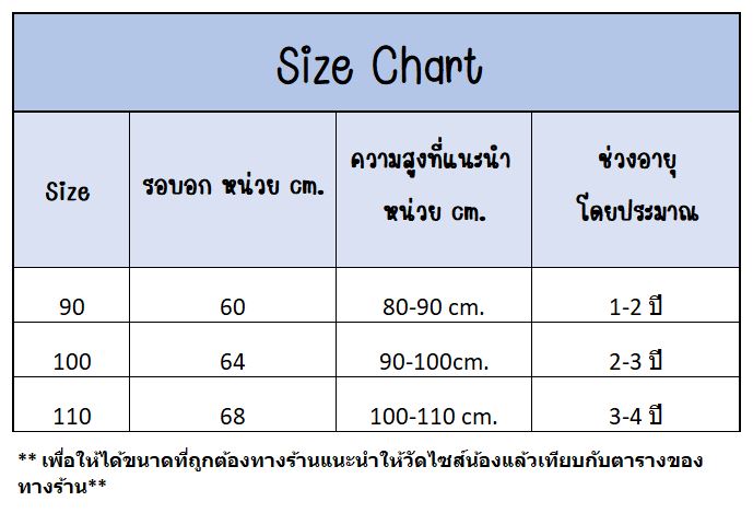 | รายละเอียดสินค้า | ชุดนอนเด็ก ชุดนอนเด็กขายาว แขน3ส่วน ผ้าCotton Silk ผ้าบาง ใส่นอนสบาย ไม่ร้อน [สินค้าพร้อมส่ง] คุณสมบัติสินค้า - ผ้า Cotton Silk (เนื้อผ้าไม่ยืด) - ผ้าบาง น้ำหนักเบา ระบายอากาศ ใส่ไม่ร้อน - แขน 3 ส่วน ขายาว - ขอบเอวเป็นยางยืด ไม่อึดอัด ขนาดไซส์ ไซส์90รอบอก 60 cm.สูง 90 cm.อายุ1-2 ปี ไซส์100 รอบอก 64 cm.สูง 100 cm. อายุ 2-3 ปี ไซส์110 รอบอก 68 cm.สูง 110 cmอายุ3-4 ปี                    |