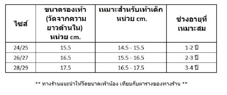 ไซส์ 28/29 สำหรับเท้าน้องยาว 16.5 cm อายุโดยประมาณ 3-4 ขวบ
