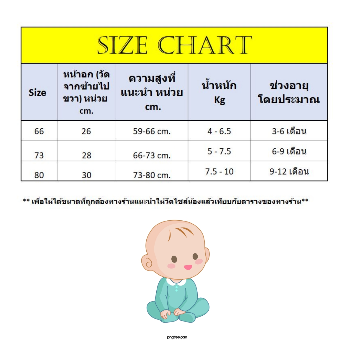 คุณสมบัติ- ผ้าคอตตอน 100%- ผ้านุ่มใส่สบาย ไม่ระคายเคืองผิวเด็ก- ตัดเย็บประณีต- ลายการ์ตูน น่ารัก- ไซส์สำหรับเด็ก 3-12 เดือนตารางขนาดไซส์ไซส์ หน้าอก (cm.) ส่วนสูงแนะนำ(cm.) น้ำหนักแนะนำ(Kg) ช่วงอายุโดยประมาณ 66 26*2 59 - 66 4 - 6.5 3 - 6 เดือน 73 28*2 66 - 73 5 - 7.5 6 - 9 เดือน 80 30*2 73 - 80 7.5 - 10 9 - 12 เดือน** ทางร้านแนะนำให้ลูกค้าวัดไซส์น้องตามจริง แล้วเทียบกับข้อมูลที่ทางร้านให้ไว้** **ทางร้านแนะนำให้แยกผ้าสี กับผ้าขาวในการซักผ้า**หมายเหตุ:- สินค้าอาจมีขนาดคลาดเคลื่อน 1-2 ซม. อันเกิดจากการตัดเย็บจากทางโรงงาน ทางร้านต้องขออภัยมา ณ ที่นี่