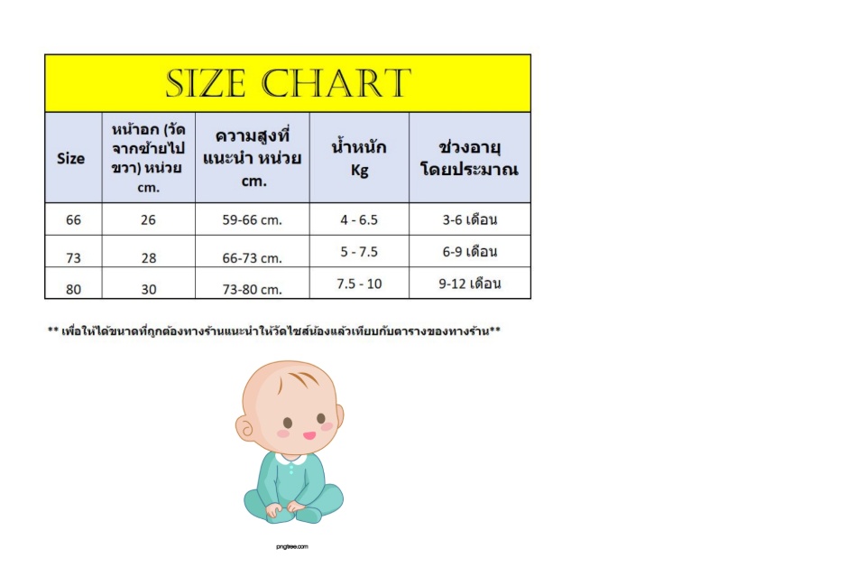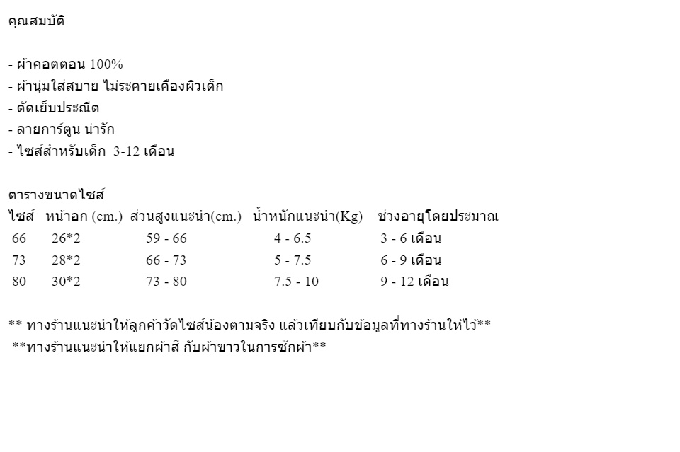 | รายละเอียดสินค้า | ชุดเด็กแรกเกิด เสื้อผ้าเด็กอ่อน ชุดเด็กทารก บอดี้สูทเด็ก ชุดหมีเด็ก romper baby แขนยาว ขายาว [สินค้าพร้อมส่งในไทย] คุณสมบัติ - ผ้าคอตตอน 100% - ผ้านุ่มใส่สบาย ไม่ระคายเคืองผิวเด็ก - ตัดเย็บประณีต - ลายการ์ตูน น่ารัก - ไซส์สำหรับเด็ก  3-12 เดือน ตารางขนาดไซส์ ไซส์   หน้าอก (cm.)  ส่วนสูงแนะนำ(cm.)   น้ำหนักแนะนำ(Kg)    ช่วงอายุโดยประมาณ  66       26*2                  59 - 66                        4 - 6.5                   3 - 6 เดือน  73       28*2                  66 - 73                        5 - 7.5                   6 - 9 เดือน  80       30*2                  73 - 80                        7.5 - 10                 9 - 12 เดือน ** ทางร้านแนะนำให้ลูกค้าวัดไซส์น้องตามจริง แล้วเทียบกับข้อมูลที่ทางร้านให้ไว้**  **ทางร้านแนะนำให้แยกผ้าสี กับผ้าขาวในการซักผ้า** หมายเหตุ: - สินค้าอาจมีขนาดคลาดเคลื่อน 1-2  ซม. อันเกิดจากการตัดเย็บจากทางโรงงาน ทางร้านต้องขออภัยมา ณ ที่นี่ 📣คำแนะนำในการการสั่งซื้อสินค้าของทางร้าน -ร้านจัดส่งสินค้าทุกวัน (ยกเว้นวันอาทิตย์ และวันหยุดนกขัตฤกษณ์) โดยตัดรอบส่งดังนี้ # EMS ไปรษณีย์ไทย ตัดรับก่อนเวลา 11.00 น. # Standard Delivery  ตัดรับก่อนเวลา 11.00 น. - การสั่งซื้อทุกครั้งโปรดตรวจสอบ ชื่อ ที่อยู่ เบอร์โทร ให้ถูกต้อง  - การเปลี่ยนชื่อ ที่อยู่ สามารถทำได้โดยการเพิ่มที่อยู่ใหม่ที่ต้องการ และกดที่ “แก้ไข” และกดเลือกที่อยู่ที่ต้องการ ***หากมีการกดนัดรับและมีเลขพัสดุแล้วจะไม่สามารถ เปลี่ยนแปลงได้หลังการสั่งซื้อ ทุกกรณี ลูกค้ากระทำได้โดยการยกเลิกคำสั่งซื้อ และให้กดสั่ง order ใหม่ 📣กรณีสินค้ามีปัญหา - สินค้าชำรุดเกิดได้จากหลายกรณี ชำรุดจากการผลิต ชำรุดจากขนส่ง  - ทักแชทหาทางร้าน เพื่อเคลมสินค้า   - หากลูกค้ามีการให้คะแนน กดรับสินค้า คอมเม้นท์ หรือใช้งาน **ทางร้านไม่สามารถเคลมสินค้าได้ทุกกรณี** - การเคลมสินค้า หากยังไม่กดรับสินค้า ให้ลูกค้าทักแชทกลับมาที่ร้านค้าเพื่อรับการช่วยเหลือ #ชุดหมี #ชุดหมีเด็ก #romper #ชุดสูทเด็ก #ชุดเด็กทารก #เสื้อเด็กแรกเกิด #เสื้อผ้าเด็กอ่อน #ชุดเด็กแรกเกิด #บอดี้สูทเด็ก #หุ้มเท้า      |