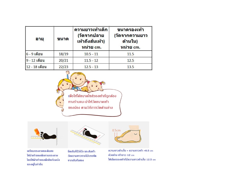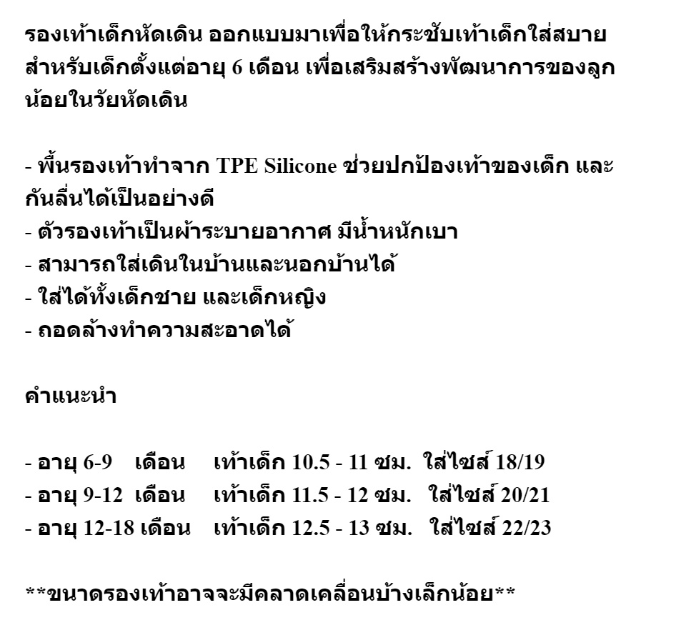 | รายละเอียดสินค้า | รองเท้าหัดเดิน รองเท้าเด็ก พื้นซิลิโคน นุ่ม ป้องกันการลื่นไถลได้ดี รายละเอียดสินค้า - พื้นเป็นซิลิโคน นุ่ม สบายเท้า และกันลื่นได้เป็นอย่างดี - บริเวณห่อหุ้มเท้าเป็นผ้า ระบายอากาศ น้ำหนักเบา - ใส่ได้ทั้งชาย หญิง - ใส่ได้ทั้งในบ้านและนอกบ้าน - ถอดล้างทำความสะอาดได้ ขนาดไซส์ - อายุ 6-9    เดือน     เท้าเด็ก 10.5 - 11 ซม.  ใส่ไซส์ 18/19  - อายุ 9-12  เดือน     เท้าเด็ก 11.5 - 12 ซม.   ใส่ไซส์ 20/21 - อายุ 12-18 เดือน    เท้าเด็ก 12.5 - 13 ซม.   ใส่ไซส์ 22/23 ขนาดรองเท้าอาจจะมีคลาดเคลื่อนบ้างเล็กน้อย *** เฉดสีของลวดลายรองเท้าอาจแตกต่างกันเล็กน้อย ตามล๊อตการผลิตขอโรงงาน *** **แนะนำให้วัดเท้าของน้อง และเทียบกับตารางไซส์ของทางร้าน** 📣📣 คำแนะนำ จากทางร้านในการสั่งซื้อ - ร้านค้าไม่สามารถเปลี่ยนที่อยู่จัดส่ง จากที่ลูกค้าแจ้งทางแชทได้  แนะนำลูกค้าเปลี่ยนที่อยูจัดส่งจากในระบบ shopee โดยตรง ตามปกติจะสามารถเปลี่ยนได้ 1 ครั้ง ก่อนร้านทำการนัดรับกับทางขนส่ง หากไม่สามารถเปลี่ยนได้ ให้ทำการยกเลิก order แล้วทำ order เข้ามาใหม่ (ที่แก้ไขที่อยู่จัดส่งแล้ว) - ร้านค้าจัดส่งสินค้าทุกวัน จันทร์ - เสาร์  (หยุด วันอาทิตย์ และวันหยุดนักขตฤกษ์)  ตัดรอบส่งเวลา 11.00 น. 📣📣กรณีรับสินค้าแล้วพบว่าสินค้ามีปัญหา ชำรุด - ให้ทำการแชทกลับมายังร้านค้า เพื่อทำการเคลมสินค้า ร้านยินดีให้บริการเต็มที่ - กรณีลูกค้ากดรับสินค้า และมีการรีวิวให้คะแนนแล้ว **ทางร้านไม่สามารถรับเคลมสินค้าได้**      |