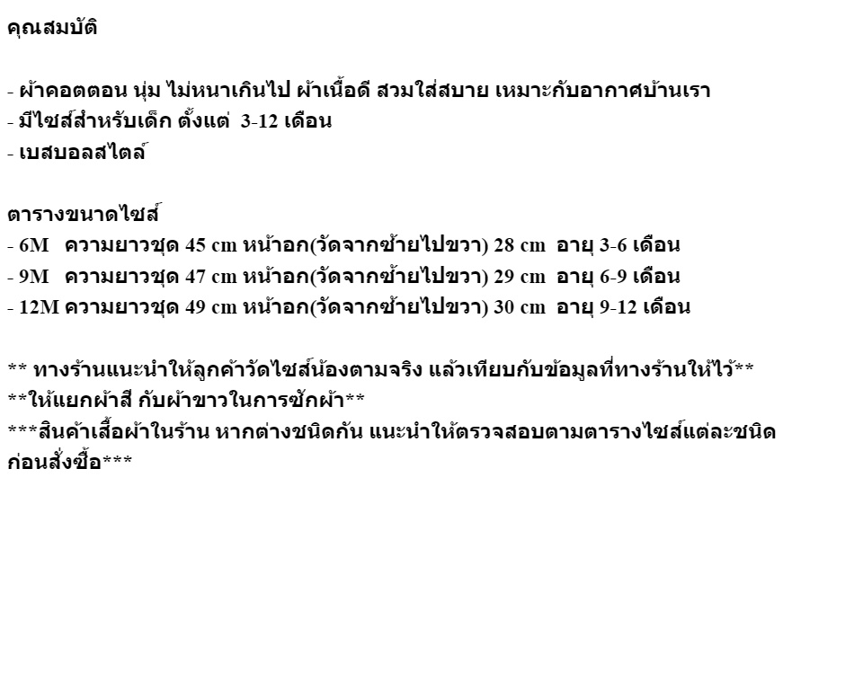 | ไฮไลท์ | ชุดเด็กทารก เสื้อผ้าเด็กอ่อน ชุดหมีเด็ก romper baby แขนสั้น ขาสั้น เนื้อผ้าดี สไตล์เบสบอล คุณสมบัติ - ผ้าคอตตอน นุ่ม ไม่หนาเกินไป ผ้าเนื้อดี สวมใส่สบาย เหมาะกับอากาศบ้านเรา - มีไซส์สำหรับเด็ก ตั้งแต่ 3-12 เดือน - เบสบอลสไตล์ ตารางขนาดไซส์ - 6M ความยาวชุด 45 cm หน้าอก(วัดจากซ้ายไปขวา) 28 cm อายุ 3-6 เดือน - 9M ความยาวชุด 47 cm หน้าอก(วัดจากซ้ายไปขวา) 29 cm อายุ 6-9 เดือน - 12M ความยาวชุด 49 cm หน้าอก(วัดจากซ้ายไปขวา) 30 cm อายุ 9-12 เดือน ** ทางร้านแนะนำให้ลูกค้าวัดไซส์น้องตามจริง แล้วเทียบกับข้อมูลที่ทางร้านให้ไว้** **ให้แยกผ้าสี กับผ้าขาวในการซักผ้า** ***สินค้าเสื้อผ้าในร้าน หากต่างชนิดกัน แนะนำให้ตรวจสอบตามตารางไซส์แต่ละชนิด ก่อนสั่งซื้อ*** |