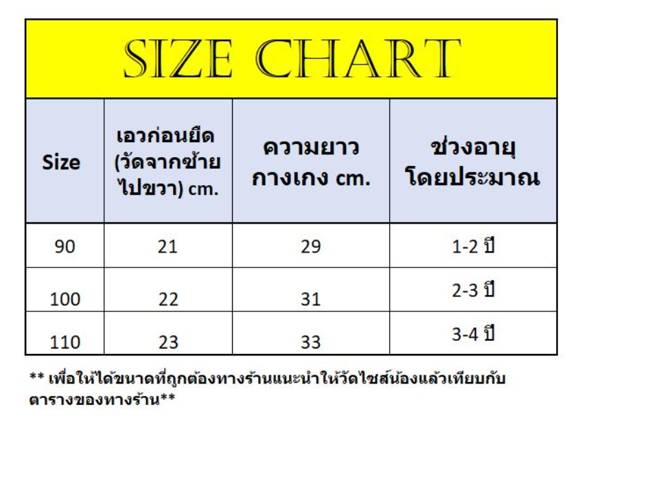 Size 110  เอวก่อนยืด 23 cm (วัดจากซ้ายไปขวา)  ยาว 33 cm  สำหรับ 3-4 ปี