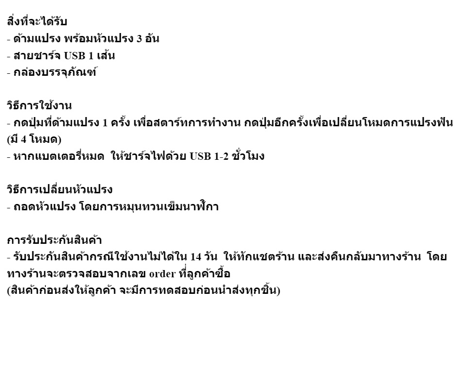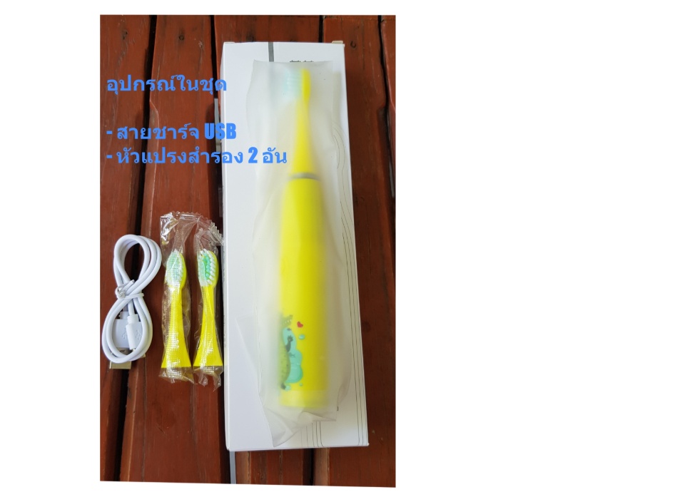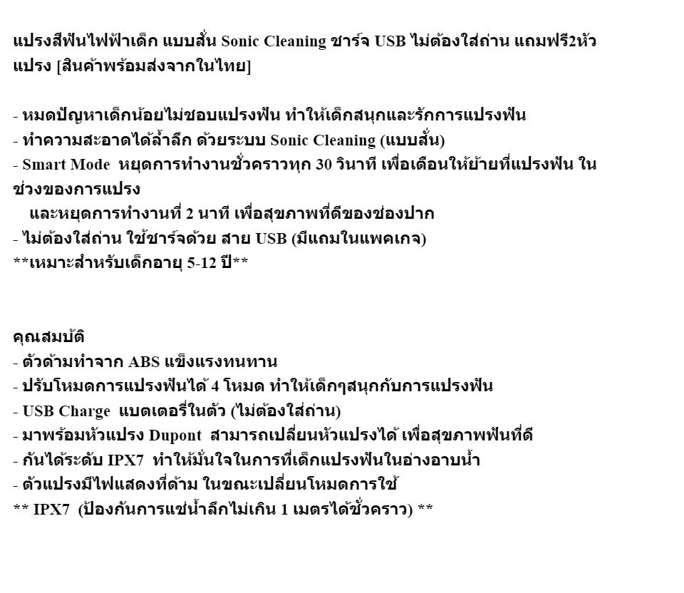 | รายละเอียดสินค้า | แปรงสีฟันไฟฟ้าเด็ก แบบสั่น Sonic Cleaning ชาร์จ USB ไม่ต้องใส่ถ่าน แถมฟรี2หัวแปรง [สินค้าพร้อมส่งจากในไทย] - หมดปัญหาเด็กน้อยไม่ชอบแปรงฟัน ทำให้เด็กสนุกและรักการแปรงฟัน - ทำความสะอาดได้ล้ำลึก ด้วยระบบ Sonic Cleaning (แบบสั่น) - Smart Mode  หยุดการทำงานชั่วคราวทุก 30 วินาที เพื่อเตือนให้ย้ายที่แปรงฟัน ในช่วงของการแปรง     และหยุดการทำงานที่ 2 นาที เพื่อสุขภาพที่ดีของช่องปาก - ไม่ต้องใส่ถ่าน ใช้ชาร์จด้วย สาย USB (มีแถมในแพคเกจ) **เหมาะสำหรับเด็กอายุ 5-12 ปี** คุณสมบ้ติ - ตัวด้ามทำจาก ABS แข็งแรงทนทาน  - ปรับโหมดการแปรงฟันได้ 4 โหมด ทำให้เด็กๆสนุกกับการแปรงฟัน - USB Charge  แบตเตอรี่ในตัว (ไม่ต้องใส่ถ่าน) - มาพร้อมหัวแปรง Dupont  สามารถเปลี่ยนหัวแปรงได้ เพื่อสุขภาพฟันที่ดี - กันได้ระดับ IPX7  ทำให้มั่นใจในการที่เด็กแปรงฟันในอ่างอาบน้ำ - ตัวแปรงมีไฟแสดงที่ด้าม ในขณะเปลี่ยนโหมดการใช้ ** IPX7  (ป้องกันการแช่น้ำลึกไม่เกิน 1 เมตรได้ชั่วคราว) ** สิ่งที่จะได้รับ - ด้ามแปรง พร้อมหัวแปรง 5 อัน - สายชาร์จ USB 1 เส้น - กล่องบรรจุภัณฑ์ วิธีการใช้งาน - กดปุ่มที่ด้ามแปรง 1 ครั้ง เพื่อสตาร์ทการทำงาน กดปุ่มอีกครั้งเพื่อเปลี่ยนโหมดการแปรงฟัน (มี 4 โหมด) - หากแบตเตอรี่หมด  ให้ชาร์จไฟด้วย USB 1-2 ชั่วโมง วิธีการเปลี่ยนหัวแปรง - ถอดหัวแปรง โดยการหมุนทวนเข็มนาฬิกา การรับประกันสินค้า - รับประกันสินค้ากรณีใช้งานไม่ได้ใน 14 วัน  ให้ทักแชตร้าน และส่งคืนกลับมาทางร้าน  โดยทางร้านจะตรวจสอบจากเลข order ที่่ลูกค้าซื้อ (สินค้าก่อนส่งให้ลูกค้า จะมีการทดสอบก่อนนำส่งทุกชิ้น) ================================================================================== 📣คำแนะนำในการการสั่งซื้อสินค้าของทางร้าน -ร้านจัดส่งสินค้าทุกวัน (ยกเว้นวันอาทิตย์ และวันหยุดนกขัตฤกษณ์) โดยตัดรอบส่งดังนี้ # EMS ไปรษณีย์ไทย ตัดรับก่อนเวลา 11.00 น. # Standard Delivery  ตัดรับก่อนเวลา 11.00 น. - การสั่งซื้อทุกครั้งโปรดตรวจสอบ ชื่อ ที่อยู่ เบอร์โทร ให้ถูกต้อง  - การเปลี่ยนชื่อ ที่อยู่ สามารถทำได้โดยการเพิ่มที่อยู่ใหม่ที่ต้องการ และกดที่ “แก้ไข” และกดเลือกที่อยู่ที่ต้องการ ***หากมีการกดนัดรับและมีเลขพัสดุแล้วจะไม่สามารถ เปลี่ยนแปลงได้หลังการสั่งซื้อ ทุกกรณี ลูกค้ากระทำได้โดยการยกเลิกคำสั่งซื้อ และให้กดสั่ง order ใหม่ 📣กรณีสินค้ามีปัญหา - สินค้าชำรุดเกิดได้จากหลายกรณี ชำรุดจากการผลิต ชำรุดจากขนส่ง  - ทักแชทหาทางร้าน เพื่อเคลมสินค้า   - หากลูกค้ามีการให้คะแนน กดรับสินค้า คอมเม้นท์ หรือใช้งาน **ทางร้านไม่สามารถเคลมสินค้าได้ทุกกรณี** - การเคลมสินค้า หากยังไม่กดรับสินค้า ให้ลูกค้าทักแชทกลับมาที่ร้านค้าเพื่อรับการช่วยเ